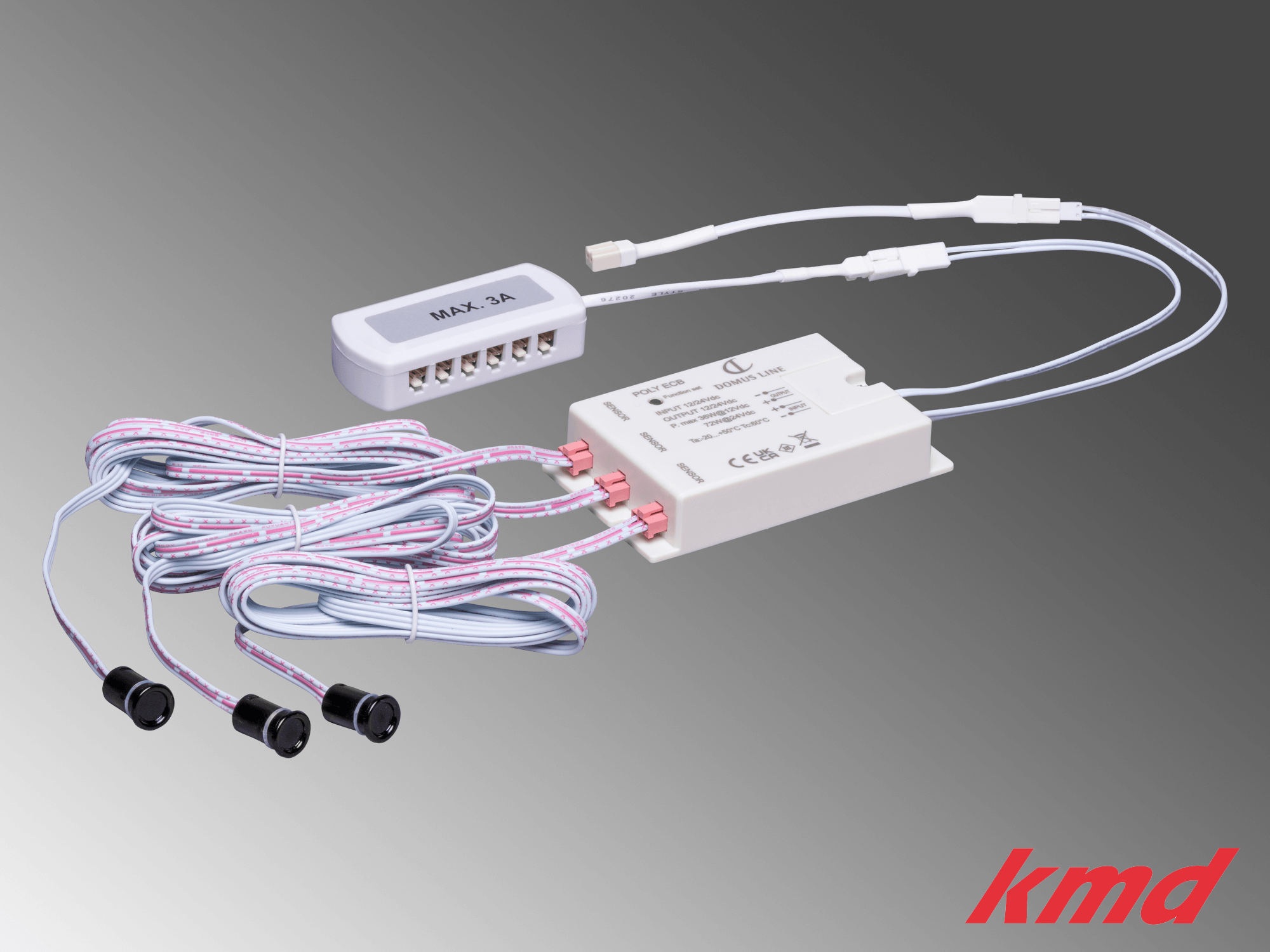 bestehend aus: 1x Poly Infrarot-Steuermodul zu LED 12V DC und 24V DC Systemen / 12V DC max. 36W / 24V DC max. 72W / Zuleitung zu Betriebsgerät 200mm mit JMT Ministecker / Zuleitung mit JMT 12-fach Verteiler zu Leuchten 200mm / zum Anschluss von 1-3 Sensoren / 3x Poly Infrarotsensoren zum Einbohren / Anschlussleitung 2000mm